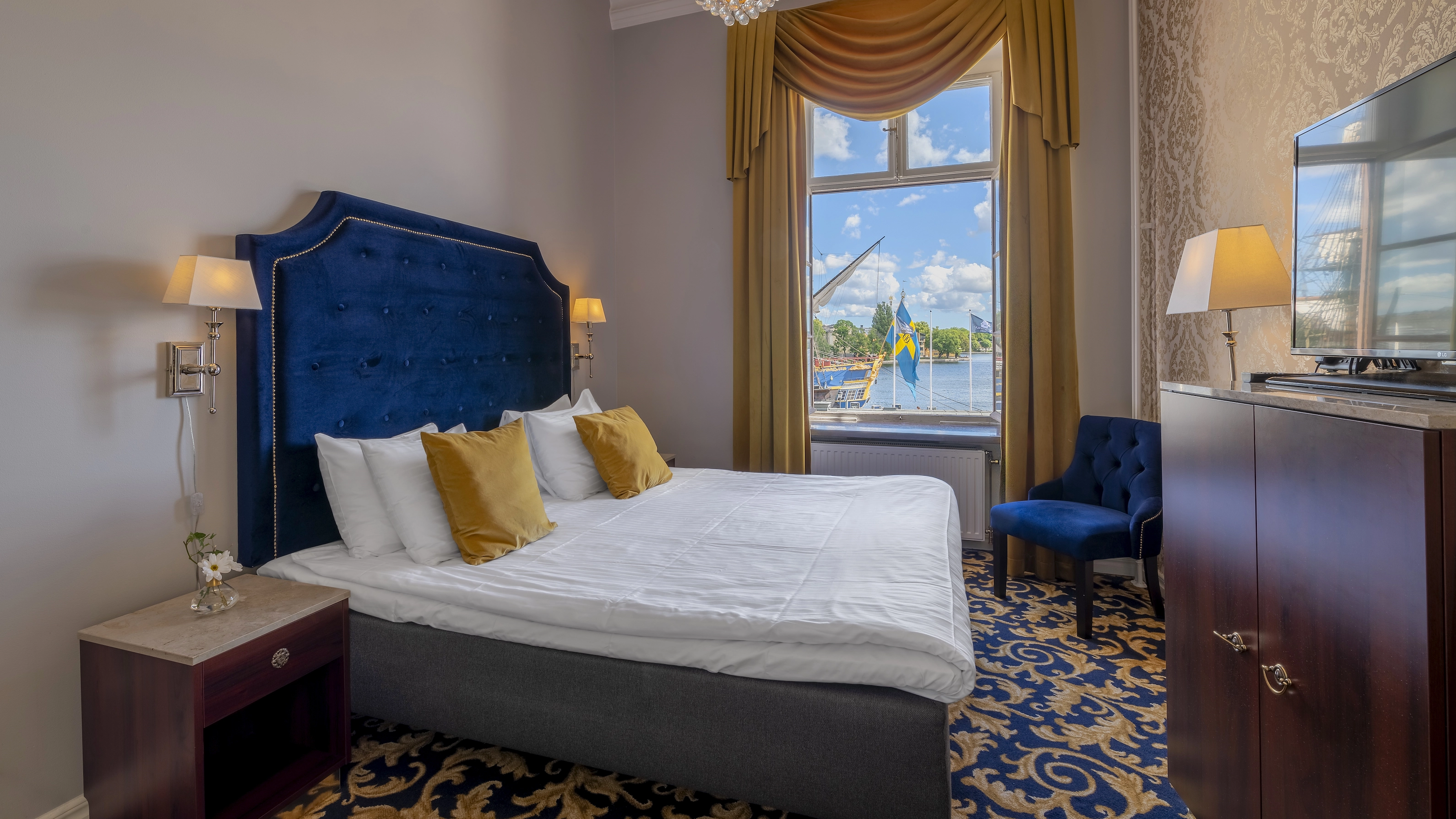 Our Premium Sea View rooms are 18-22 ㎡ and fully carpeted. They are equipped with a King-Size bed, 180 cm. All rooms have private bathrooms and a view over Saltsjön, Skeppsholmen and the inlet of Stockholm. These rooms feature a combination of sideboard, coffee table, wardrobe, writing desk and chairs.